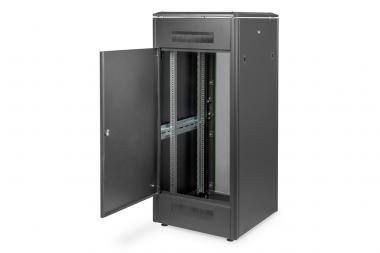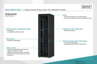 Die Netzwerkschränke der Unique Serie wurden für den benutzerfreundlichen Einbau von aktiven- und passiven Netzwerkkomponenten einhergehend mit einer sauberen Verkabelung entwickelt. Jeder Schrank wird aus bis zu 1,5 mm starkem Stahlblech gefertigt und sorgt auf Grund von spezieller Blechbiegetechnik als robuste Stahlkonstruktion für eine sehr gute Stabilität. Die Farbgebung erfolgt durch Pulverbeschichtung in den Farben Grau (RAL 7035) und Schwarz (RAL 9005). Im Sonderfall kann eine Demontage der Schränke erfolgen, um auch schwer zugängliche Aufstellungsorte zu erreichen. Die Türen lassen sich leicht demontieren, ein Türanschlagswechsel kann vorgenommen werden. Das Dach ist ausgestattet mit einem abgesetzten Deckel inkl. Lüftungsschlitzen für eine verbesserte Luftzirkulation. Desweiteren ist das Dach vorbereitet für die Aufnahme eines Lüftermoduls zur aktiven Entlüftung. Die Netzwerkschränke beinhalten 2 Paare (4 Stück) montierte 483 mm (19)-Profilschienen im Inneren. Diese sind galvanisiert und mit einer Markierung der Höheneinheit versehen (zählbar in beide Richtungen). Sie lassen sich in der Tiefe verstellen und sind zusätzlich mit Tiefenstreben im Schrank verbunden um so einen intensiven Ausbau mit 483 mm (19")-Komponenten zu ermöglichen. Ein wichtiger Aspekt bei der Installation ist das Kabelmanagement. Im Boden eines jeden Schrankes befindet sich ein aufschiebbarer Kabeleinlass mit Moosgummidichtung. Schränke ab 26HE sind ausgestattet mit zwei rückseitigen Kabeleinlässen mit Bürstenleiste ober- und unterhalb der Rücktür. Für Schränke mit einer Breite ab 800 mm werden die Kabelführungsmöglichkeiten durch zusätzliche Einlässe mit Bürstenleiste links und rechts im Dach und Boden erweitert. Desweiteren sind vertikale Kabelführungskanäle mit Blende links und rechts der 483 mm (19")-Profilschienen in der Front montiert (bei Schränken ab 32HE und 800 mm Breite). Ein umfangreich erhältliches Portfolio an Zubehör für die Kabelrangierung, Fachböden, etc. hilft viele Anforderungen der täglichen Praxis zu erfüllen.