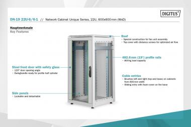 Die Netzwerkschränke der Unique Serie wurden für den benutzerfreundlichen Einbau von aktiven- und passiven Netzwerkkomponenten einhergehend mit einer sauberen Verkabelung entwickelt. Jeder Schrank wird aus bis zu 1,5 mm starkem Stahlblech gefertigt und sorgt auf Grund von spezieller Blechbiegetechnik als robuste Stahlkonstruktion für eine sehr gute Stabilität. Die Farbgebung erfolgt durch Pulverbeschichtung in den Farben Grau (RAL 7035) und Schwarz (RAL 9005). Im Sonderfall kann eine Demontage der Schränke erfolgen, um auch schwer zugängliche Aufstellungsorte zu erreichen. Die Türen lassen sich leicht demontieren, ein Türanschlagswechsel kann vorgenommen werden. Das Dach ist ausgestattet mit einem abgesetzten Deckel inkl. Lüftungsschlitzen für eine verbesserte Luftzirkulation. Desweiteren ist das Dach vorbereitet für die Aufnahme eines Lüftermoduls zur aktiven Entlüftung. Die Netzwerkschränke beinhalten 2 Paare (4 Stück) montierte 483 mm (19)-Profilschienen im Inneren. Diese sind galvanisiert und mit einer Markierung der Höheneinheit versehen (zählbar in beide Richtungen). Sie lassen sich in der Tiefe verstellen und sind zusätzlich mit Tiefenstreben im Schrank verbunden um so einen intensiven Ausbau mit 483 mm (19")-Komponenten zu ermöglichen. Ein wichtiger Aspekt bei der Installation ist das Kabelmanagement. Im Boden eines jeden Schrankes befindet sich ein aufschiebbarer Kabeleinlass mit Moosgummidichtung. Schränke ab 26HE sind ausgestattet mit zwei rückseitigen Kabeleinlässen mit Bürstenleiste ober- und unterhalb der Rücktür. Für Schränke mit einer Breite ab 800 mm werden die Kabelführungsmöglichkeiten durch zusätzliche Einlässe mit Bürstenleiste links und rechts im Dach und Boden erweitert. Desweiteren sind vertikale Kabelführungskanäle mit Blende links und rechts der 483 mm (19")-Profilschienen in der Front montiert (bei Schränken ab 32HE und 800 mm Breite). Ein umfangreich erhältliches Portfolio an Zubehör für die Kabelrangierung, Fachböden, etc. hilft viele Anforderungen der täglichen Praxis zu erfüllen.