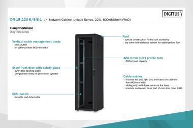 Die Netzwerkschränke der Unique Serie wurden für den benutzerfreundlichen Einbau von aktiven- und passiven Netzwerkkomponenten einhergehend mit einer sauberen Verkabelung entwickelt. Jeder Schrank wird aus bis zu 1,5 mm starkem Stahlblech gefertigt und sorgt auf Grund von spezieller Blechbiegetechnik als robuste Stahlkonstruktion für eine sehr gute Stabilität. Die Farbgebung erfolgt durch Pulverbeschichtung in den Farben Grau (RAL 7035) und Schwarz (RAL 9005). Im Sonderfall kann eine Demontage der Schränke erfolgen, um auch schwer zugängliche Aufstellungsorte zu erreichen. Die Türen lassen sich leicht demontieren, ein Türanschlagswechsel kann vorgenommen werden. Das Dach ist ausgestattet mit einem abgesetzten Deckel inkl. Lüftungsschlitzen für eine verbesserte Luftzirkulation. Desweiteren ist das Dach vorbereitet für die Aufnahme eines Lüftermoduls zur aktiven Entlüftung. Die Netzwerkschränke beinhalten 2 Paare (4 Stück) montierte 483 mm (19)-Profilschienen im Inneren. Diese sind galvanisiert und mit einer Markierung der Höheneinheit versehen (zählbar in beide Richtungen). Sie lassen sich in der Tiefe verstellen und sind zusätzlich mit Tiefenstreben im Schrank verbunden um so einen intensiven Ausbau mit 483 mm (19")-Komponenten zu ermöglichen. Ein wichtiger Aspekt bei der Installation ist das Kabelmanagement. Im Boden eines jeden Schrankes befindet sich ein aufschiebbarer Kabeleinlass mit Moosgummidichtung. Schränke ab 26HE sind ausgestattet mit zwei rückseitigen Kabeleinlässen mit Bürstenleiste ober- und unterhalb der Rücktür. Für Schränke mit einer Breite ab 800 mm werden die Kabelführungsmöglichkeiten durch zusätzliche Einlässe mit Bürstenleiste links und rechts im Dach und Boden erweitert. Desweiteren sind vertikale Kabelführungskanäle mit Blende links und rechts der 483 mm (19")-Profilschienen in der Front montiert (bei Schränken ab 32HE und 800 mm Breite). Ein umfangreich erhältliches Portfolio an Zubehör für die Kabelrangierung, Fachböden, etc. hilft viele Anforderungen der täglichen Praxis zu erfüllen.