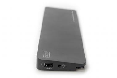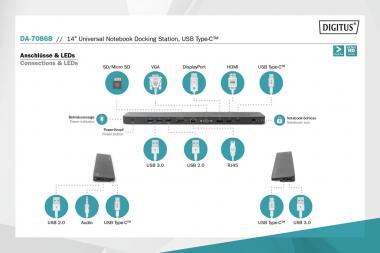 Die 14" Docking Station von DIGITUS® erweitert Ihr Notebook um 14 weitere Ports über nur einen USB-C Anschluss. Sie verfügt u.a. über 3 Videoports (HDMI, DisplayPort, VGA) zum Anschluss von Monitor, Beamer und TV. Dank Triple Monitor Support können diese zeitgleich betrieben werden. Unter Windows lässt sich ein Videosignal auf die drei verschiedenen Videoports gleichzeitig ausgeben (SST Mode), darüberhinaus lassen sich auch 3 verschiedene Videosignale auf die 3 Grafikports ausgeben (MST Mode). Unter Mac OS wird lediglich der SST Mode unterstütz. Die übrigen Schnittstellen bieten Ihnen Konnektivität zu allen gängigen Anschlüssen, die eine moderne Docking Station bieten muss. Beispielsweise einen Netzwerkanschluss, weitere USB-Anschlüsse (USB-C, USB-A), einen Audioausgang und zwei unabhängige Kartenleser. Durch den integrierten USB-C Port mit PD Charging können Sie während der Verwendung der Docking Station Ihren Laptop aufladen. Ebenso bietet die Docking Station diverse USB 3.0 und 2.0 Ports zur Datenübertragung, Anschluss von Perpheriegeräten wie z. B. Maus und Tastatur sowie zum Laden von Mobilgeräten. Dank smarter Kabelführung unterhalb der Dockingstation ist der Anschluss beidseitig (links oder rechts) am Notebook möglich. - Machen Sie mehr aus Ihrem Notebook und erweitern Sie Ihre Möglichkeiten - Sie benötigen lediglich einen freien USB-C Anschluss.
