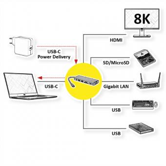 Dockingstation USB Typ C, 8K30 HDMI, USB 3.2 Gen 1 (Typ-A), PD, LAN, SD/MicroSD