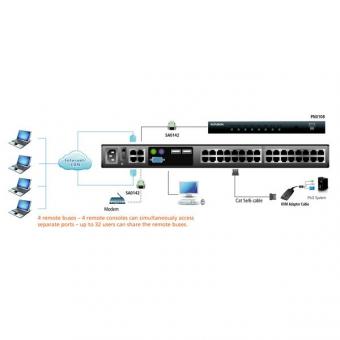 Dabei unterstützt ein spezielles Nachrichtenboard - ähnlich wie ein Internet-Chat-Programm - eine beliebige Anzahl angemeldeter Benutzer beim Informationsaustausch und bei der Kommunikation untereinander, damit der eine oder andere oder alle zusammen das gesamte System überwachen und steuern können. Eine Mosaikdarstellung gibt ihnen den vollen überblick mit der überwachung von 24 Servern gleichzeitig und in Echtzeit. Weitere starke Eigenschaften des Switches sind: Unterstützung von Maus-DynaSync sowie Adapter-ID und virtuelle Datenträger.