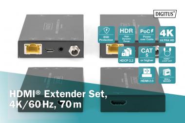 HDMI 2.0 Extender Set, 70m 4K/60Hz, 18 Gbps, HDCP 2.2, HDR, PoC