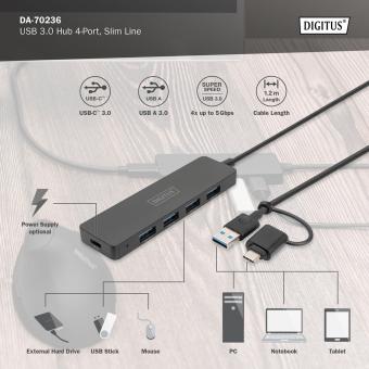 USB 3.0 Hub 4-Port, Slimline mit USB-C Adapter, 5Gbps, 1,2m Kabel