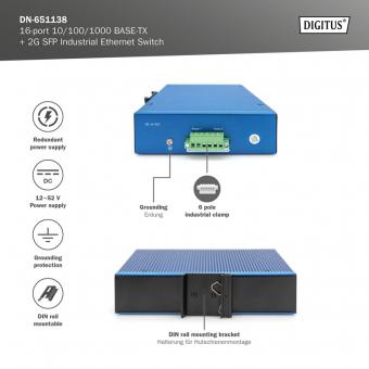 Industrieller 16+2 -Port Gigabit Ethernet Switch Unmanaged, 16 RJ45-Anschlüsse 10/100/1000 Mbits