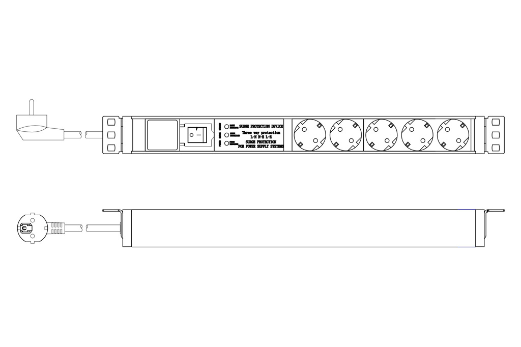 1HE Aluminium PDU, Rack Mount, 5 x Schutzkontakt 16A,230VAC,50/60Hz,overvoltage,Net filter, Switch