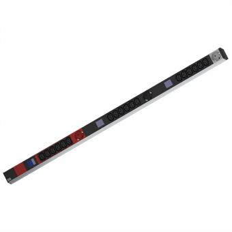 PDU 19 pouces, 1UH, 18x C13, 3x Schuko, mesure de puissance, raccordement 3x CEE 16A, rouge