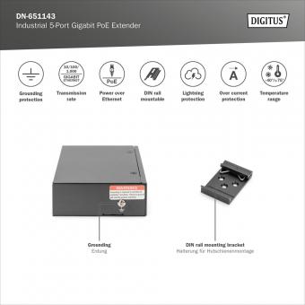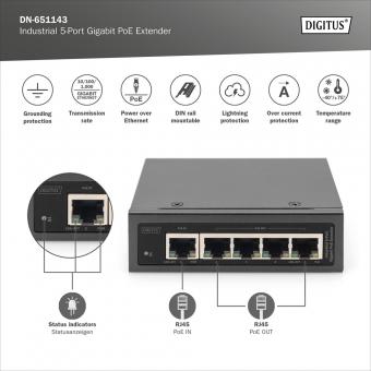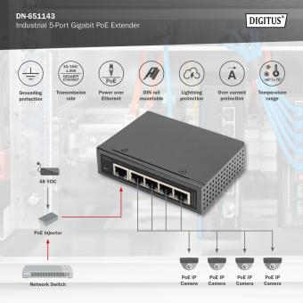 Extenseur PoE industriel Gigabit 5 ports 1 port PoE 802.3bt vers 4 ports 802.3af/at