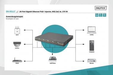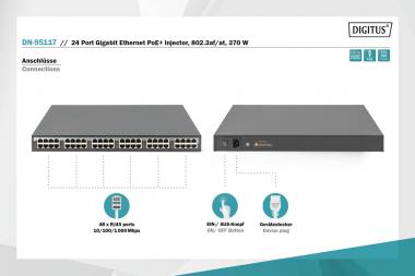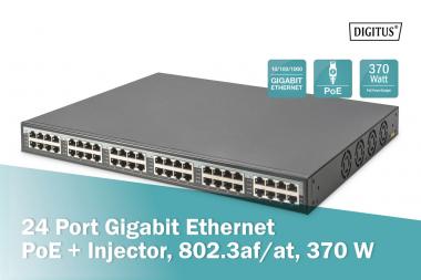 Gigabit Ethernet PoE+ Injector Hub, 802.3at, 10G 24-port, Power Pins:3/6(+), 1/2(-), 370W