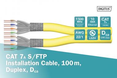 CAT 7A S-FTP installation cable, 1500MHz Dca (EN 50575), AWG 22/1, 100m ring, DX, Yellow