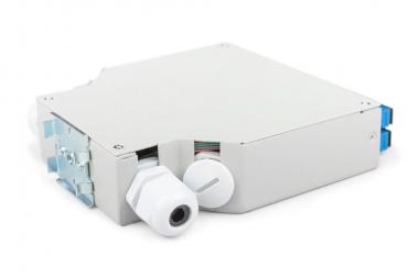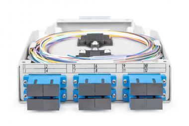 Boîte pour profilé chapeau à  fibres optiques, pré-confectionnée, SM, 6 SC DX avec pigtails et raccords