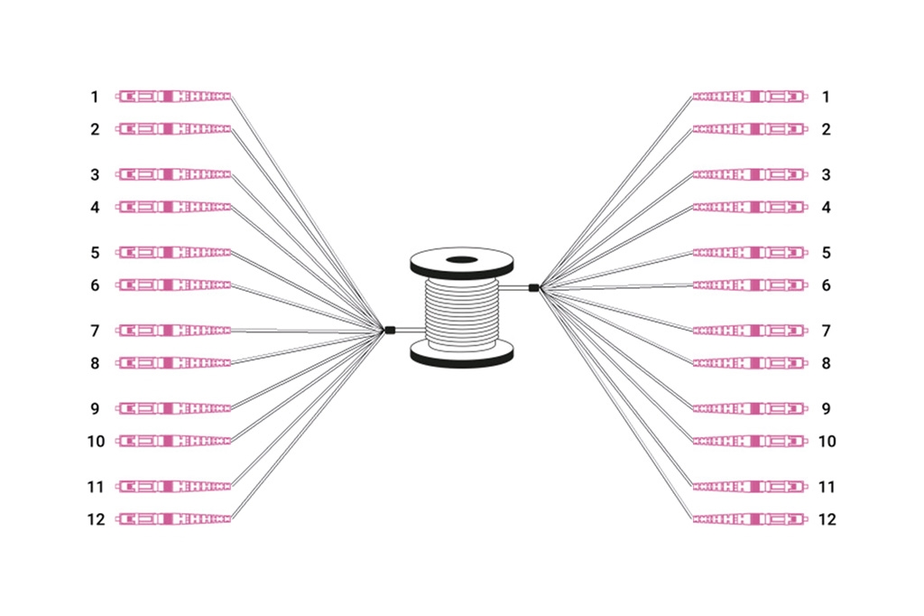 Câble breakout fibre optique universel préassemblé, multimode OM4, 12 fibres, LC/UPC - LC/UPC