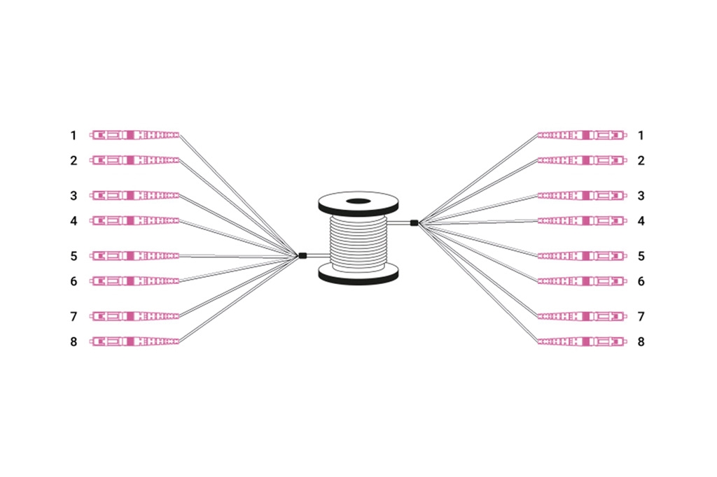 Câble breakout fibre optique universel préassemblé, multimode OM4, 8 fibres, LC/UPC - LC/UPC