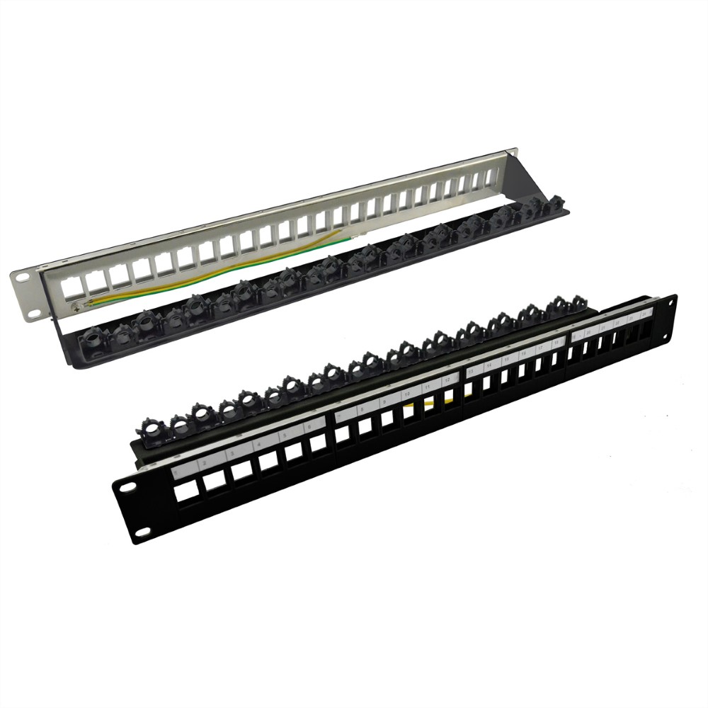 Panneau de brassage 19-pouces vide pour Keystone, 24 ports blindés, Fixation par clip, noir